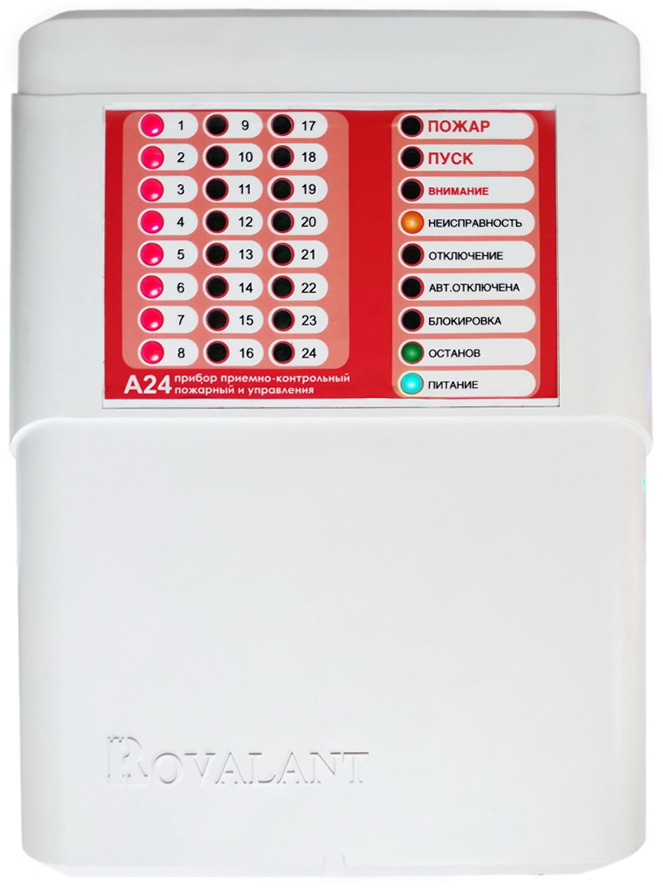Приборы приёмно-контрольные пожарные и управления ППКПиУ серии «А24» предназначены для применения в составе установок пожарной автоматики различной степени сложности. Приборы обеспечивают в зависимости от исполнения контроль до 64 адресных пожарных извещателей, а также 2-х, 4-х, 6-и или 8-и неадресных пожарных или технологических шлейфов с возможностью расширения до 24-х, а также управление и контроль исполнительных устройств посредством двух выходов типа «открытый коллектор» и трех релейных выходов с возможностью расширения до 8-ми. Приборы обеспечивают питание подключенных компонентов, оповещателей и других устройств стабилизированным напряжением 12В и током до 2.5А.