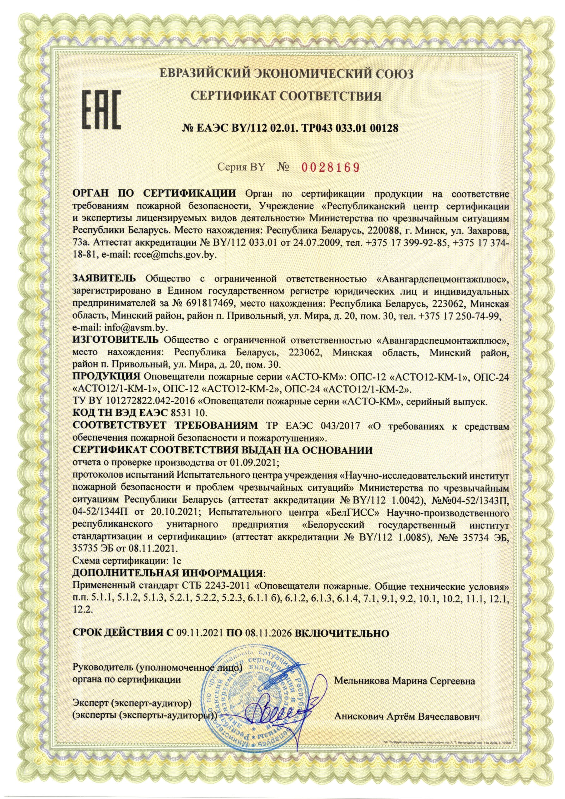 • Оповещатели пожарные световые «АСТО12-КМ-2», «АСТО12/1-КМ-2» предназначены для подключения к приборам управления пожарным с целью информирования людей о возникновении пожара, путях эвакуации, режимах работы автоматической системы противопожарной защиты посредством формирования светового сигнала, в качестве исполнительного элемента системы оповещения. Оповещатели имеют степень защиты, обеспечиваемую оболочкой оповещателя, IP44, что позволяет их эксплуатировать в помещениях, защищаемых водяными и пенными установками пожаротушения, а так же ограниченно на улице (в местах, защищенных от прямого воздействия струй воды и пылевых потоков, например под козырьками и навесами) либо в помещениях с повышенной влажностью. Оповещатели не предназначены для применения во взрывоопасных зонах.
