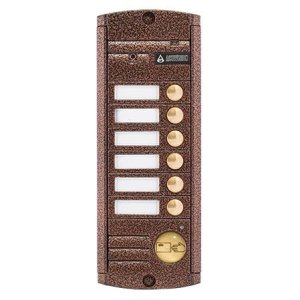 Краткое описание: Вызывная видеопанель на 6 абонентов со встроенным Proxy считывателем, накладная, 4-х проводная, 1000 ТВЛ, ИК-подсветка, память на 1005 ключей, питание 12 В, -50…+50°C, IP55, 185х70х20 мм, цвет медь