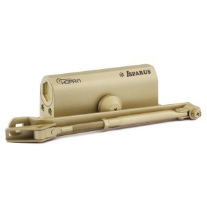 Краткое описание: Доводчик для дверей весом 50 - 110 кг. Класс доводчика EN3-5. двухскоростной, с рычажной тягой, установочный размер 165х19 мм, габариты 182х62х40 мм, -45...+60 °С, цвет - золото.