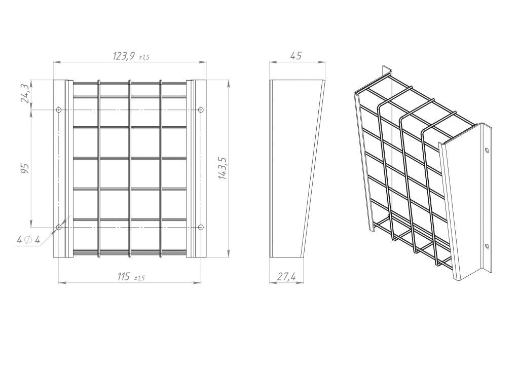 Размер 140*105*45 мм. Размер ячейки защитной сетки 25*25 мм. Толщина проволоки - 2мм. Цвет покрытия - белый
