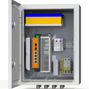 Краткое описание: Коммутационный термошкаф: промышленный неуправляемый коммутатор 4хRJ45 10/100/1000 Мб/с PoE 802.3 af/at watchdog, 2 порта IEEE 802.3af/at/bt, 2хSFP 1000 Мб/с бюджет PoE 140 Вт, блок питания 155Вт/48-58 В, обогреватель 50Вт, сдвоенный термостат, оптический кросс 4 порта SC, гермовводы 4хPG9, 4хPG13.5, автомат 6А, цвет серый, АКБ 12В 2.2Ач 4 шт, 230 В AC, 210Вт, IP66, -60°С... +50°С, 300х400х210 мм.