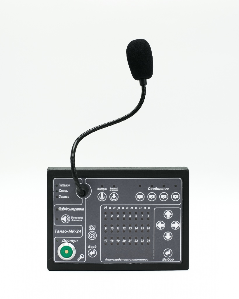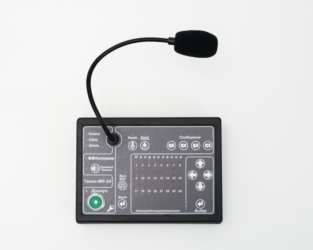 - Микрофонная консоль «Танго-МК24» предназначена для передачи сигналов от микрофона и других внешних источников на устройства оповещения. Подключается к пульту управления «Танго-ПУ/БП-24», имеет встроенный микрофонный усилитель и кнопки выбора зоны трансляции, индикацию включенных выходов, содержит схему с 4-мя дополнительными фонограммами и соответственно кнопки выбора этих фонограмм. С консоли «Танго-МК24» можно осуществить трансляцию сигналов от микрофона и внешнего источника звуковых программ на любой выход любого зонального коммутатора, включить дополнительную фонограмму, записанную в микросхему памяти микрофонной консоли.