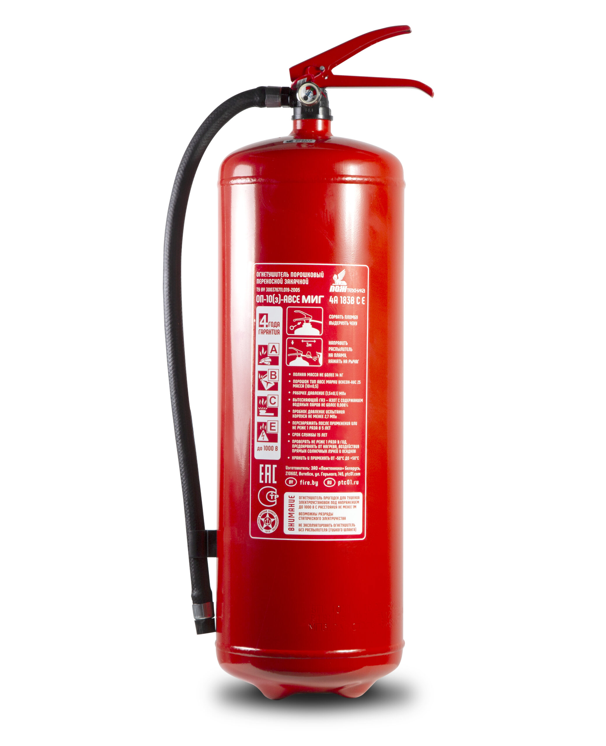 Масса заряда огнетушащего вещества - 10 кг. Ранг по модельным очагам: 3А, 94В.