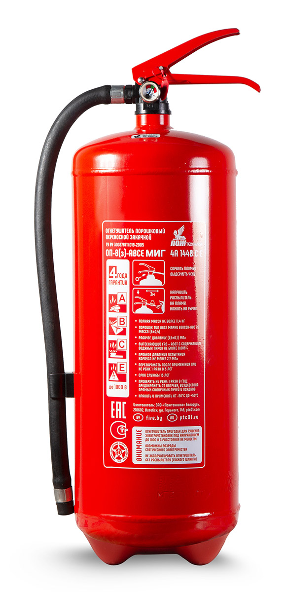 Огнетушитель ОВП-10 не предназначен для тушения горючих газов (класс C), электрооборудования (класс Е), а также для локализации возгораний металлов (класс D).