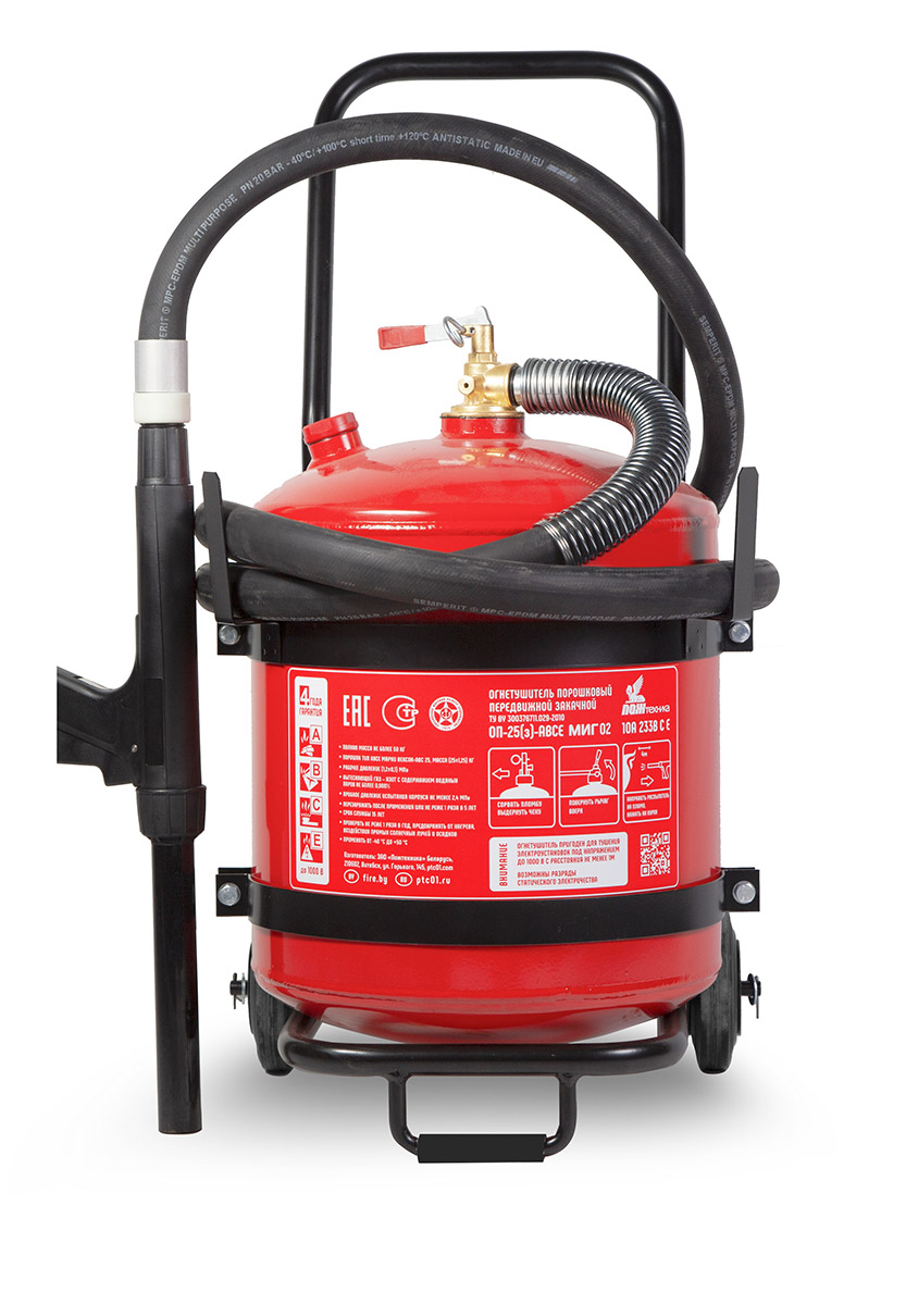Закачной порошковый огнетушитель передвижного типа ОП-25 производства МИГ (г. Витебск) предназначен для оперативного устранения очага возгорания на начальной стадии. Мелкодисперсная минеральная пыль огнетушащего порошка перекрывает доступ к кислороду, и тем самым прекращает процесс горения. Порошковый огнетушитель ОП-25 подходит для тушения основных классов пожаров: А - твердые вещества; В - горючие жидкости; С - горючие газы; Е - электрооборудование под напряжением до 1000 В. В огнетушителе в качестве ОТВ используется порошок “Вексон-ABC 25” с высокими антислеживающими свойствами и виброустойчивостью, поэтому устрйоство обладает повышенной огнетушащей способность, то есть увеличенным рангом по модельным очагам: 10А, 233В, С, Е (до 1000В). Срок службы порошковых огнетушителей МИГ увеличен до 15 лет (вместо 10 лет по ГОСТ) за счет применения надежных и прочных баллонов, сертифицированных на соответствие требованиям Технического регламента ТР ТС 032/2013 «О безопасности оборудования, работающего под избыточным давлением». На баллоне ОП-25 МИГ имеется маркировка записей паспорта, выбитых механическим способом, что исключает истирание при неблагоприятных условиях эксплуатации.