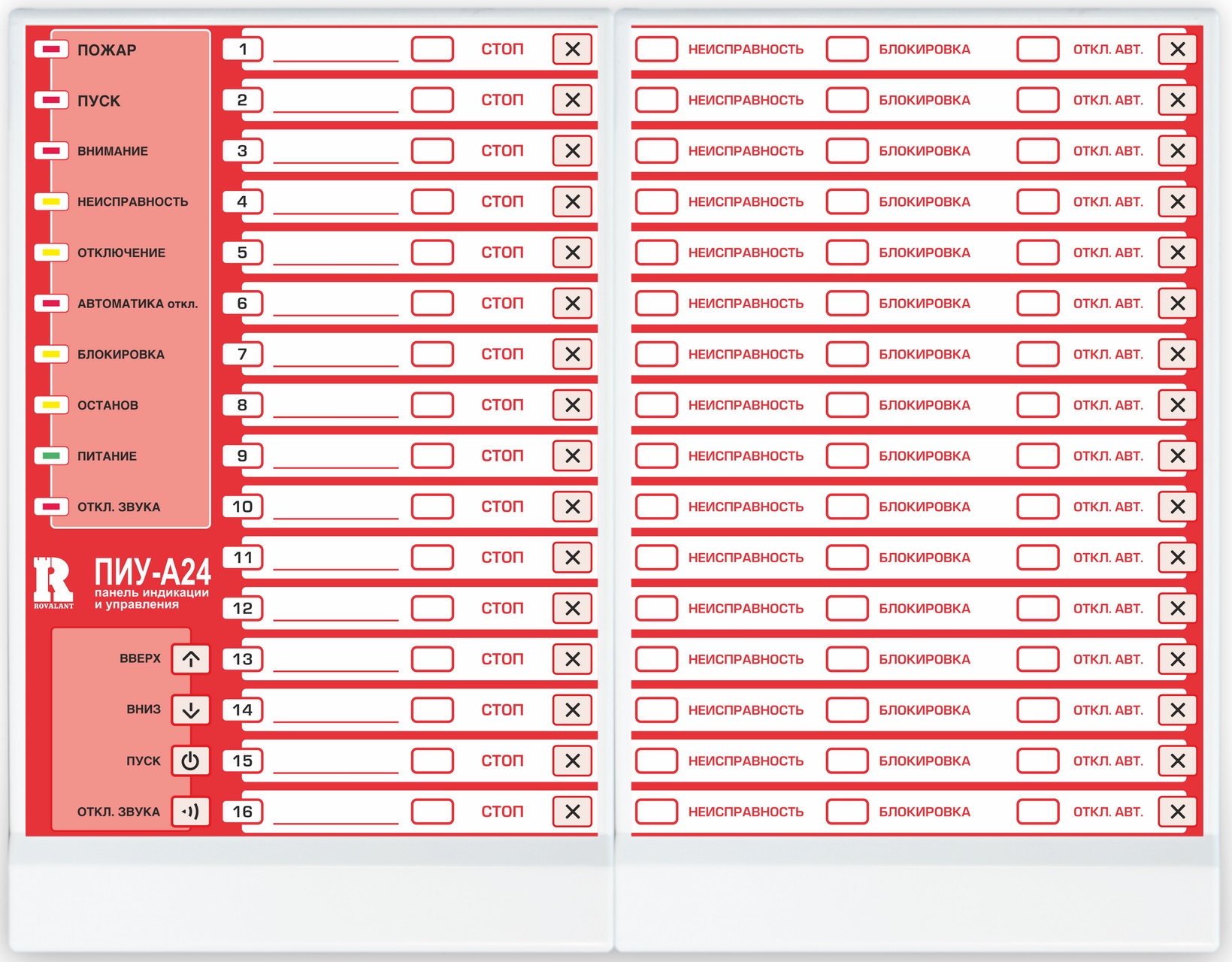 Панель индикации и управления автоматикой ПИУ-А24А предназначена для подробной индикации состояния направлений автоматики ППКПиУ серии "А24", общего состояния ППКПиУ, а также управления режимами работы направлений автоматики, их дистанционного пуска и выключения.
