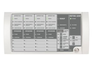 Краткое описание: Блок управления и индикации состояния прибора Поток-3Н; 24 индикатора состояния 4 пожарных агрегатов; 14 индикаторов состояния блока «Поток-3Н» и блока «Поток-БКИ»; 1 семисегментный индикатор задержки пуска; 16 индикаторов состояния пожарных и технологических разделов; два интерфейса RS-485; два входа питания, Uпит.10.2...28.4 В, Iпотр.200 мА; IP20, t-раб.-30...+50°С, 340х170х27 мм