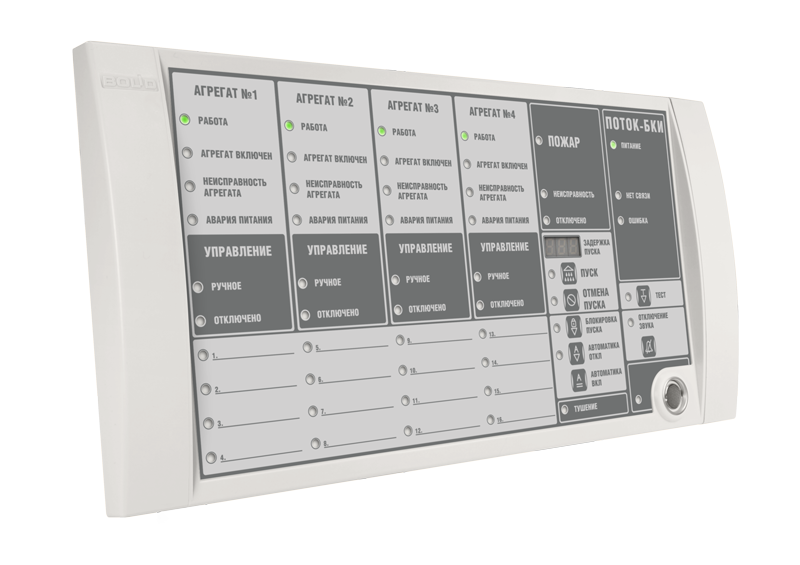 Блок оснащён 24 двухцветными индикаторами для пожарных агрегатов и 14 индикаторами для насосной станции, а также семисегментным индикатором задержки пуска.