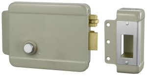 Краткое описание: Электро-механический накладной замок, нормально-закрытый, универсальный, цилиндр снаружи, кнопка изнутри, питание 12 В DC, 1 А, -40...+50 °С, окрашенная сталь