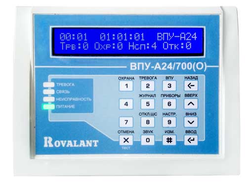 Выносная панель управления охранная ВПУ-А24/700(О) предназначена для объединения ППКО серии «А24» в сеть, отображения состояния ППКО, поступающих от ППКО извещений и другой системной информации на ЖК-дисплее, дистанционного управления режимами работы ППКО посредством сенсорных клавиш, а также выдачи обобщенной информации о состоянии ППКО на внешние устройства.
